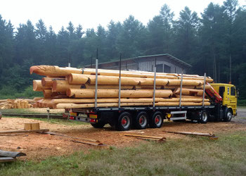 Sobald die Planung abgeschlossen ist, geht es bei uns schnell zur Sache. Innerhalb von nur 4 bis 12 Wochen richten wir Ihr Blockstammhaus komplett auf unserem Betriebsgelände vor. Das ist entscheidend, damit jedes Detail perfekt passt und wir Ihnen höchste Qualität garantieren können. Anschließend erfolgt die Demontage und die Verladung zu einem vereinbarten Liefertermin. Wir nutzen dafür spezielle Auflieger, um den Blockstammbau demontiert sicher zu transportieren. Je nach den örtlichen Gegebenheiten Ihrer Baustelle – ob auf einer bestehenden Kellerdecke oder einer Bodenplatte – beginnt der Aufbau mit einem Autokran oder einem stationären Kran. Und hier kommt der beste Teil: Da alles in Handarbeit vorbereitet wurde, kann Ihr Blockstammhaus binnen weniger Tage errichtet werden. So sehen Sie in kürzester Zeit, wie Ihr Traum Wirklichkeit wird!