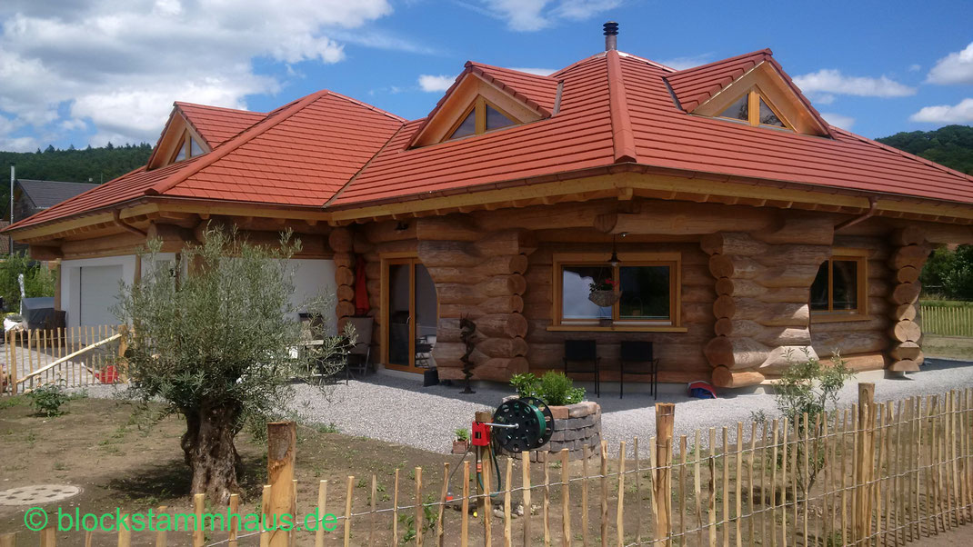 Blockstammhaus mit traditionellem Krüppelwalmdach: Ein klassisches Naturstammhaus in Frankreich gefertigt aus einheimischer Hunsrück Fichte. Dieses Projekt kombiniert massiven Kanadischen Blockbau im Erdgeschoss mit traditionellem Holzrahmenbau im Dach und verfügt über eine offene achteckige Feuerstelle